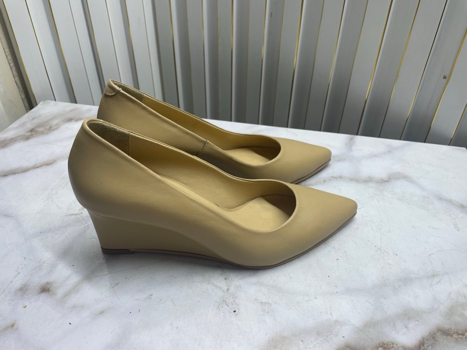 Bej renkli, dolgu topuklu kadın stilettoları. Minimalist ve çağdaş tasarıma sahip, kauçuk malzemeden üretilmiş. Ofis için uygun, zarif ve rahat bir şıklık sunar.