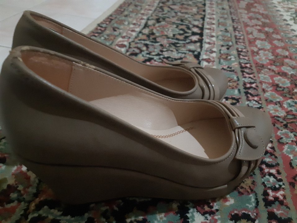 Bej renkli, tokalı dolgu topuklu kadın ayakkabısı. Kauçuk malzemeden, desen içermeyen ve klasik tarzda, günlük kullanıma uygun.