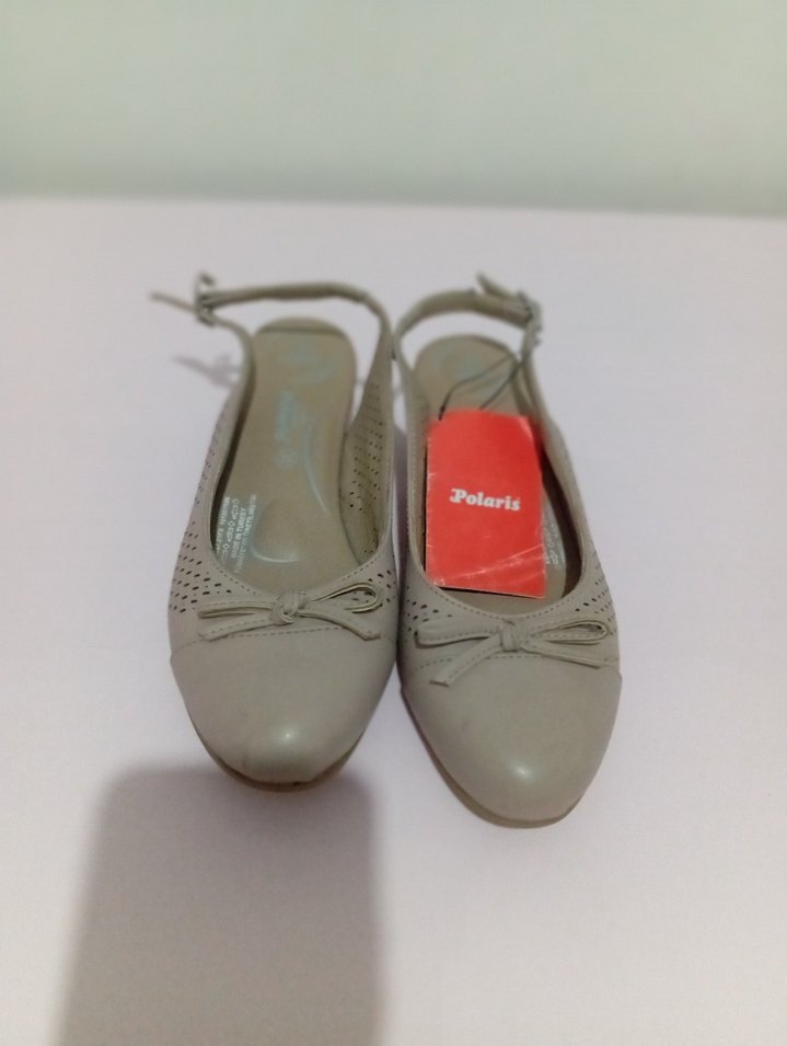 Bej renk, dolgu topuklu kadın babetler, kemerli tasarıma sahip ve minimalist stilde. Kauçuk malzemeden üretilmiş, günlük kullanıma uygun. Gri tonlarında, desensiz model. Marka: Polaris.