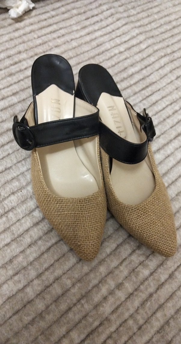 Bej dokuma üst kısmı, koyu renk tokalı kayışı ve dolgu topuğu ile kadın espadrilleri, çağdaş tarzı rahatlıkla birleştirir. Günlük kullanım için uygundur.