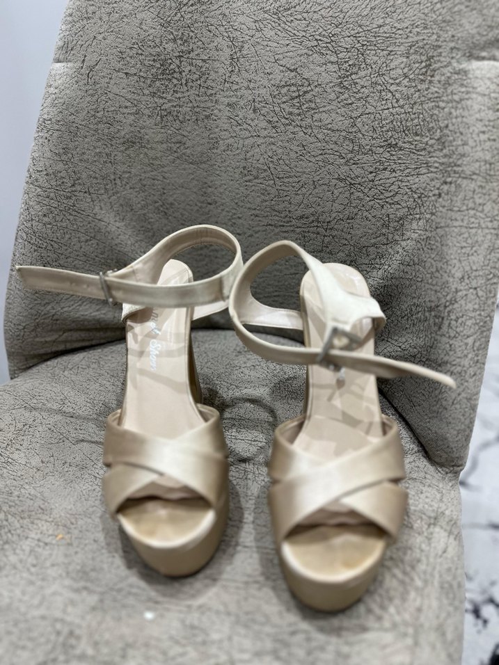 Bej renkli, saten görünümlü dolgu topuklu kadın gece ayakkabısı, tokalı ve minimalist tasarıma sahip, düğün için uygun.
