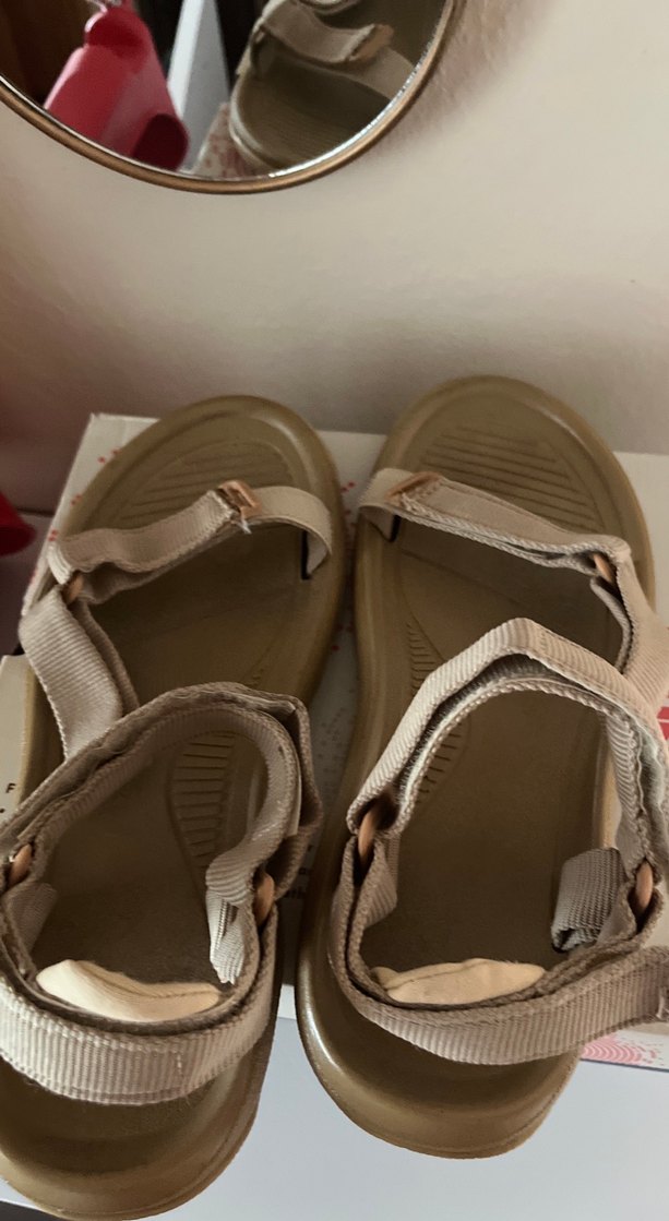 Bej renkte, dolgu topuklu, lastik malzemeden yapılmış, tokalı kadın sandalet. Dış mekan ve günlük sokak stiline uygun, sade tasarım.