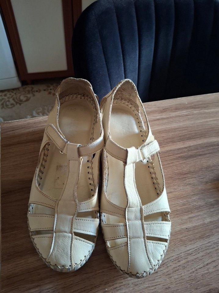 Bej renkte, dolgu topuklu ve tokalı kayışlı kadın sandaletleri. Kauçuk malzemeden, sade ve desen içermeyen tasarıma sahiptir. Günlük kullanıma uygundur.