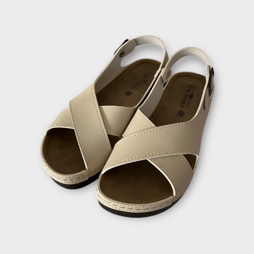Bej renkli, dolgu topuklu, tokalı kadın sandaletleri. Kauçuk malzemeden, sade ve desensiz tasarım, günlük kullanıma uygun.