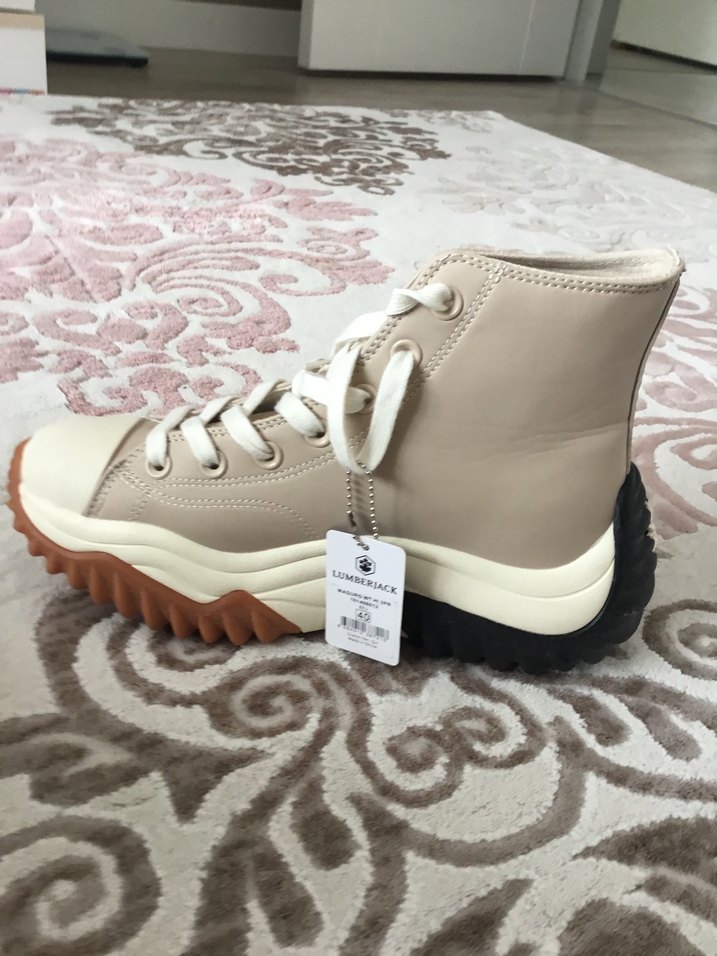 Bej renkte, dolgu topuklu ve kauçuk tabanlı kadın spor ayakkabısı. Fırfır detayı ve baskılı deseniyle trend sokak stili için uygundur.