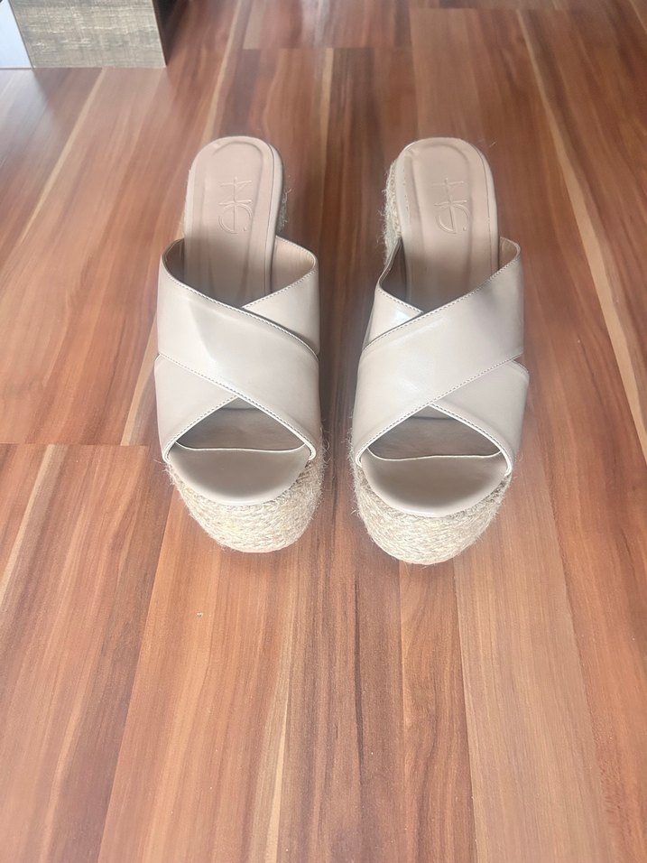 Bej çapraz bantlı, dolgu topuklu kadın terlikleri, günlük kullanıma uygun rahat ve sade bir şıklık sunar. Minimalist ve bohem tarzda, temel kombinlere uyumludur. Hiç kullanılmadı marka temsilidir.