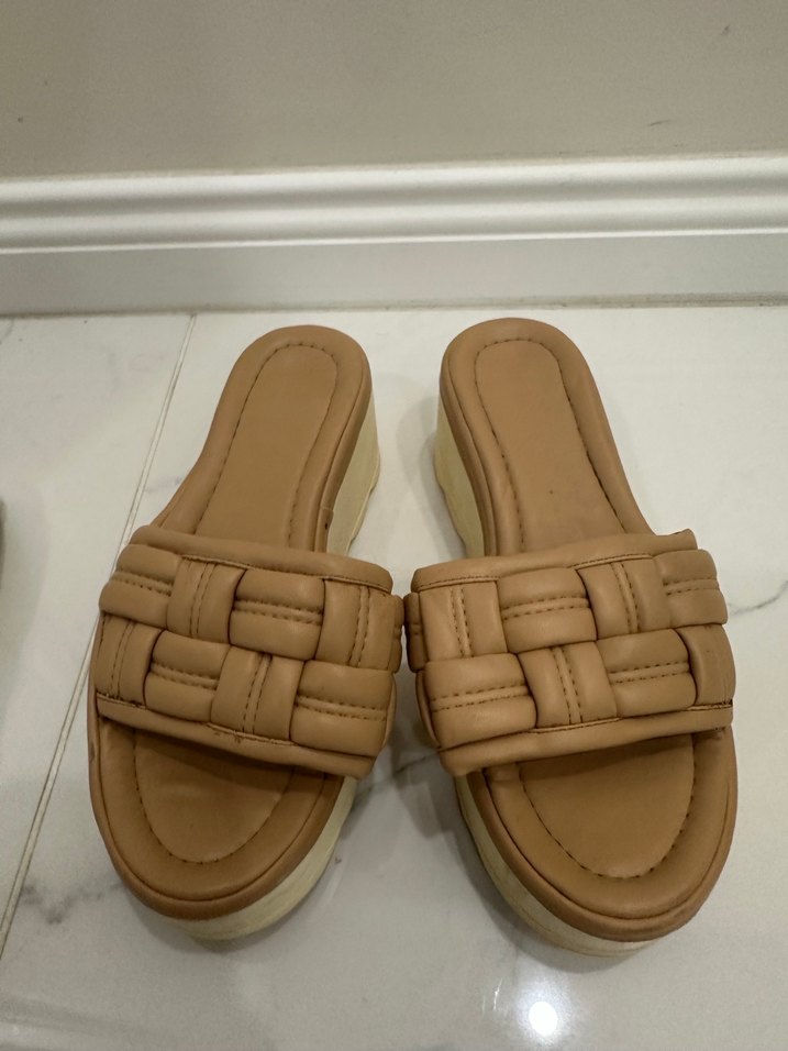 Bej renkli, dolgu topuklu ve tokalı bantlı kadın terlik. Minimalist tasarım, yumuşak pastel tonlarda, günlük sokak tarzına uygun.
