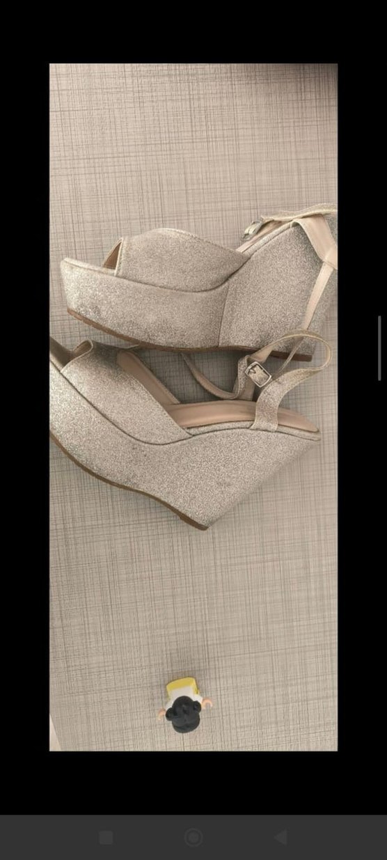 Bej renkte, tokalı kayışlı ve dolgu topuklu kadın abiye ayakkabısı. Kauçuk malzemeden üretilmiş, çağdaş stilde, düğün ve şık etkinlikler için uygun, desensiz ve trend görünümlü.