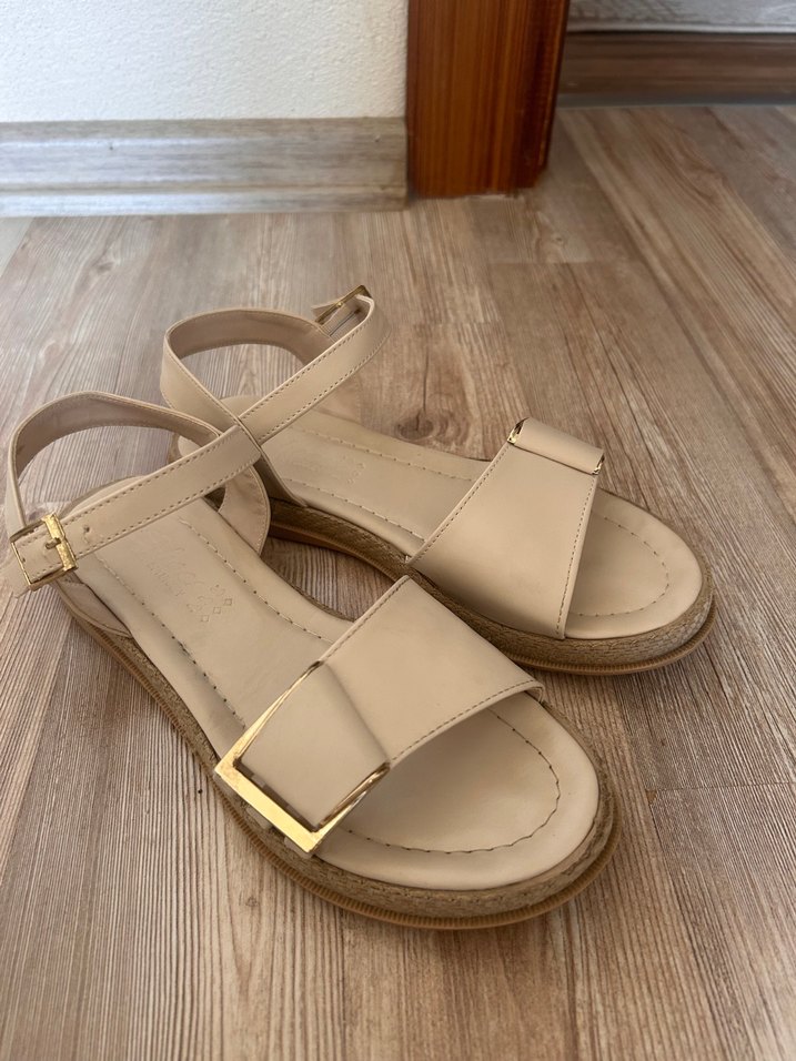 Bej renkte, tokalı bantlı kadın dolgu topuklu sandalet. Yumuşak kauçuk malzemeden, günlük rahat kullanıma uygun, minimalist ve modern klasik tarzda. 36 numara ama 35 giyen birine olur bir ay önce almıştım pahalıya aldım uyguna bırakcaayakata hos duruyr iki üç kez anca giyildi
