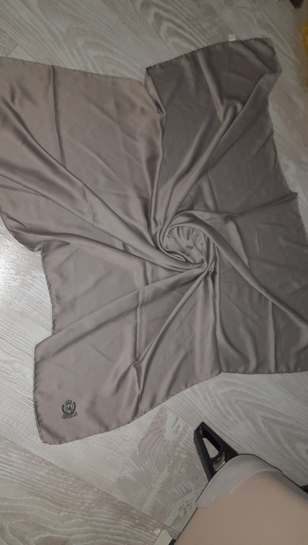 Bej renkte, sentetik kumaştan, drapeli tasarıma sahip kadın eşarp sade ve modern bir tarz sunar.