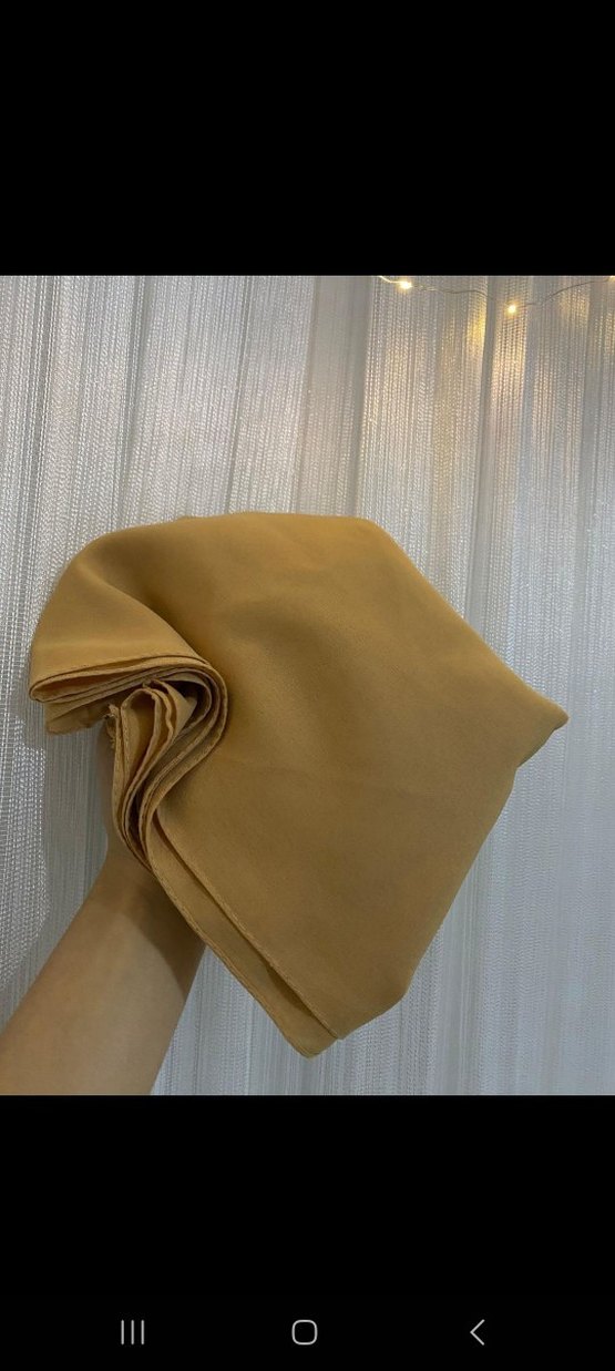 Yumuşak sentetik kumaştan yapılmış, drapeli tasarıma sahip bej kadın şalı, parlak yüzeyli ve minimal bohem tarzında.