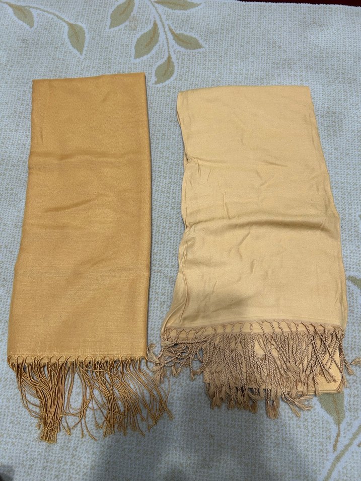 Bej renkli, saten dokulu, püsküllü ve drapeli kadın şalları, rahat ve bohem bir tarza sahiptir.