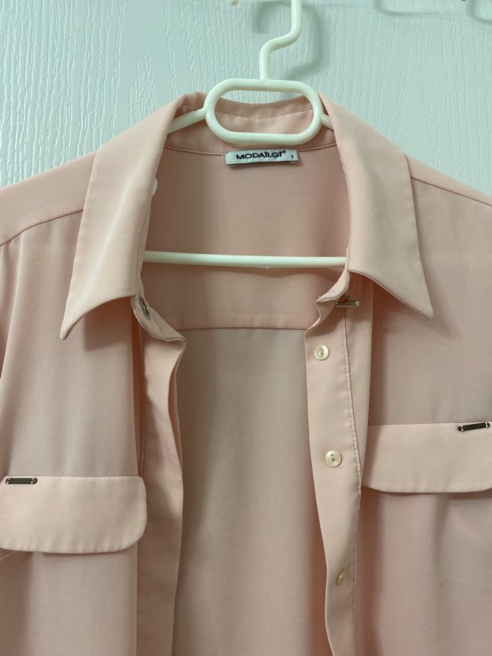 Bej renkli, düğmeli ve yakalı uzun kollu kadın gömleği. İpek gibi yumuşak kumaştan, gündelik kullanıma uygun minimalist tarzda, normal kesim.