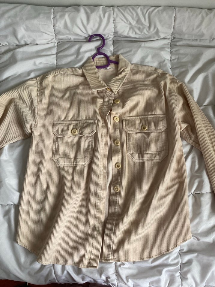 Bej kumaştan, uzun kollu, düğmeli önü ve cepli, rahat kesim kadın gömlek. Günlük ve sokak stili için uygundur.