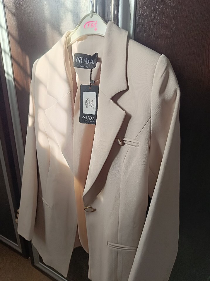 Bej renkte, düğmeli ve kesik yaka detaylı uzun kollu kadın blazer ceket. Ofis kullanımı için uygun, klasik ve şık bir tasarıma sahip. NUDA markalı.
