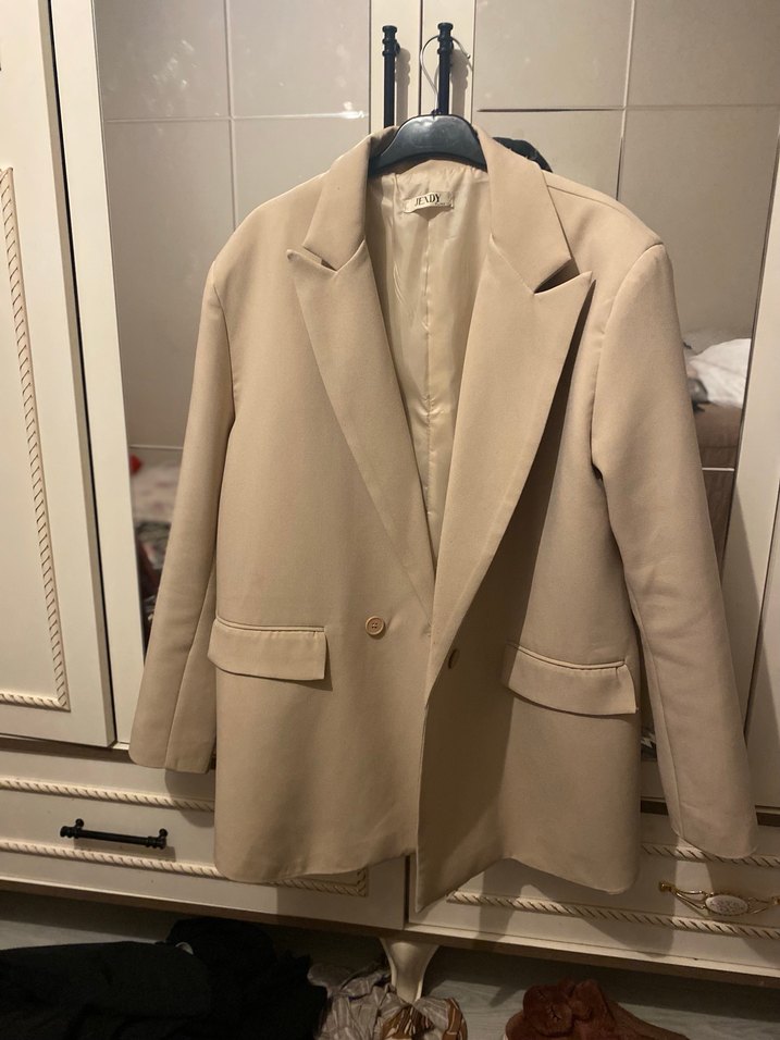 Bej renkli, düğmeli kadın blazer ceket. Normal uzunlukta, regular fit ve uzun kolludur. Ofis ve günlük kullanıma uygundur.