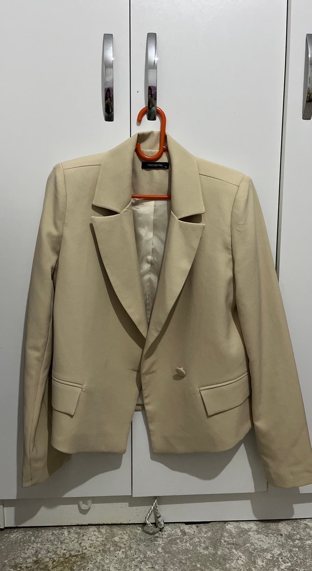 Bej renkli, düğmeli, normal boyda kadın blazer ceket. Notch yakalı, uzun kollu ve ipeksi dokulu, klasik ve şık bir tasarım. İki kere falan giydim temizdir bir lekesi yok.Yıkanabilir yıkanınca bozulmuyor
