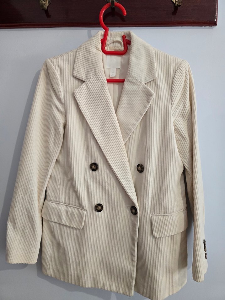 Bej renkli, düğmeli, normal uzunlukta midi blazer ceket. Uzun kollu ve regular fit ve kadife kumaş. Ofis için uygundur.