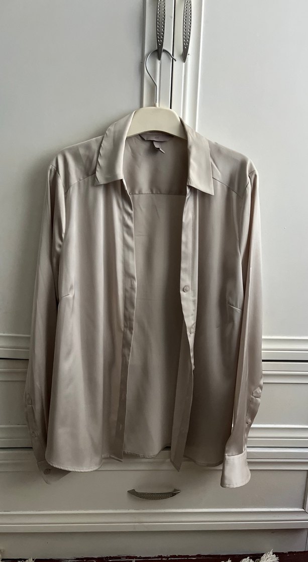 Bej renkli, saten dokulu kadın gömleği, düğmeli ve yakalıdır. Uzun kollu, normal kesim olup iş ortamları için uygundur.