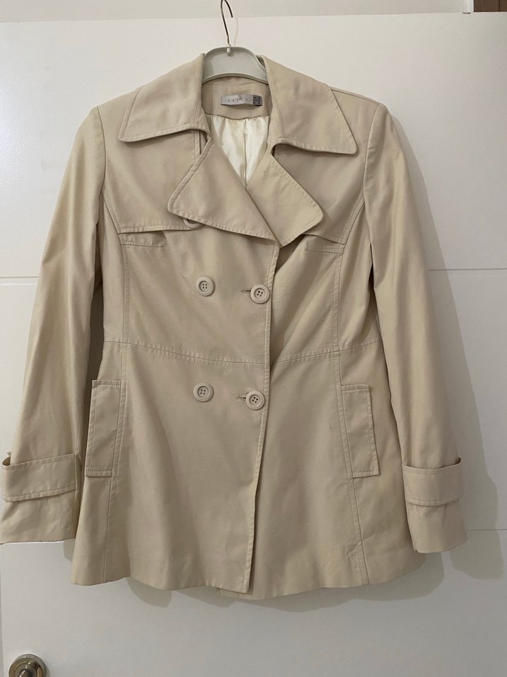 Bej renkli, düğmeli, normal boy trençkot. Uzun kollu ve notched yaka detaylı, ofis için uygun tarzda. Kemeri mevcut değil