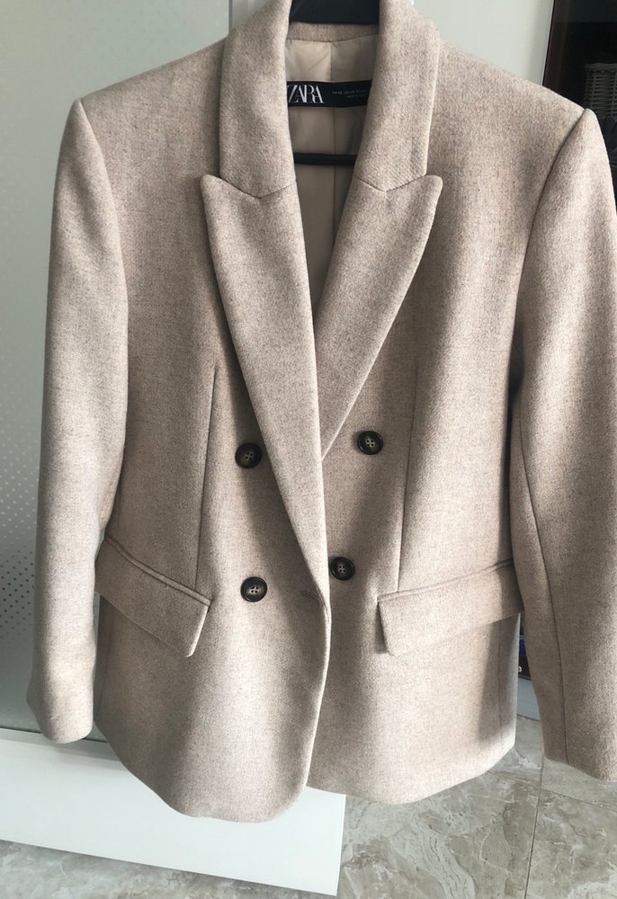 Bej renkli, yün kumaştan yapılmış, düğmeli kadın blazer. Normal kesim, uzun kollu ve klasik midi boyda, ofis için uygundur.