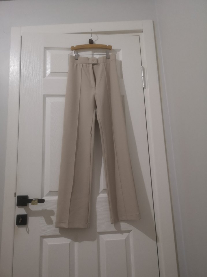 Bej yumuşak kumaştan, düz, rahat kesim kadın pantolon. Ofis için şık ve sade bir tercihtir.