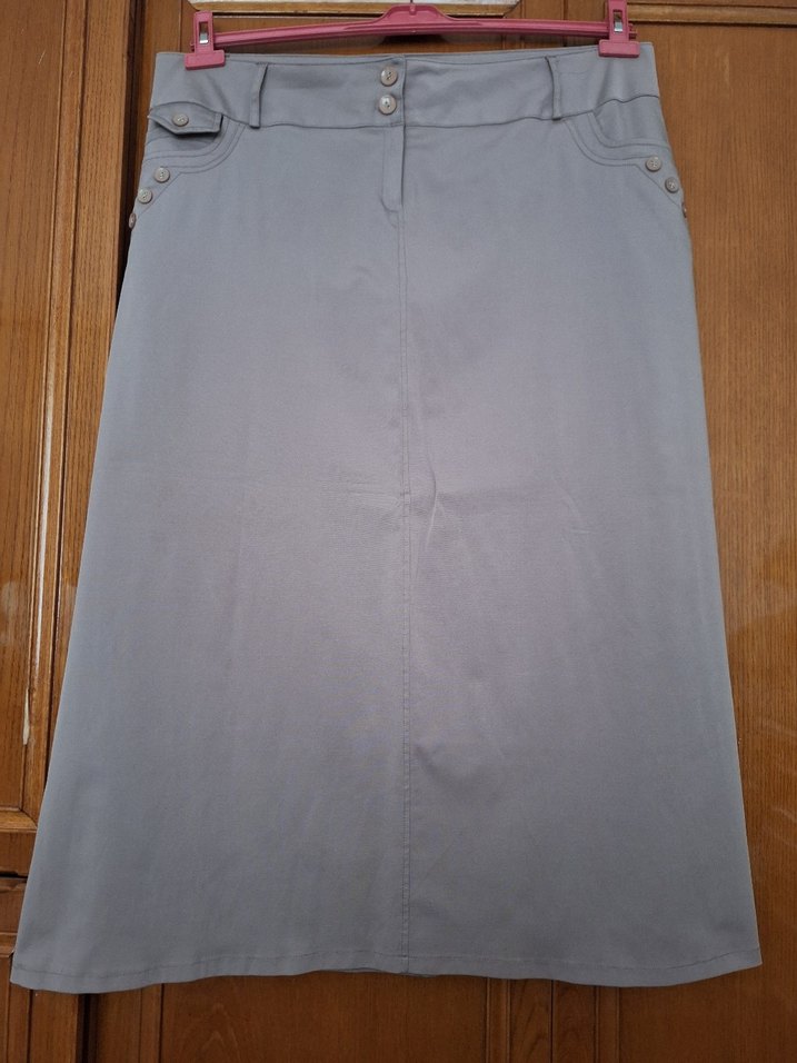 Düğmeli, düz kesim ve bej renkli midi etek. Sentetik kumaştan üretilmiş, rahat ve şık bir günlük ofis parçası. cok az kullanildi.hic bir sıkıntısı yok. küçük geldiği için satışta.kemer ölçüsü 55 cm,baseni 62 cm civari, boyu 93 cm.yazlik ince keten kumaş. ölçülere dikkat ediniz. #kadinetek#kadinyazliketek
