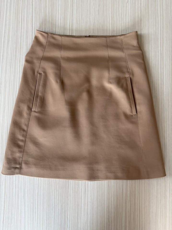 Bej renkte, düz desensiz, sentetik kumaştan yapılmış midi uzunlukta, rahat kesim kadın eteği. Ofis için minimal ve şık bir tercih.