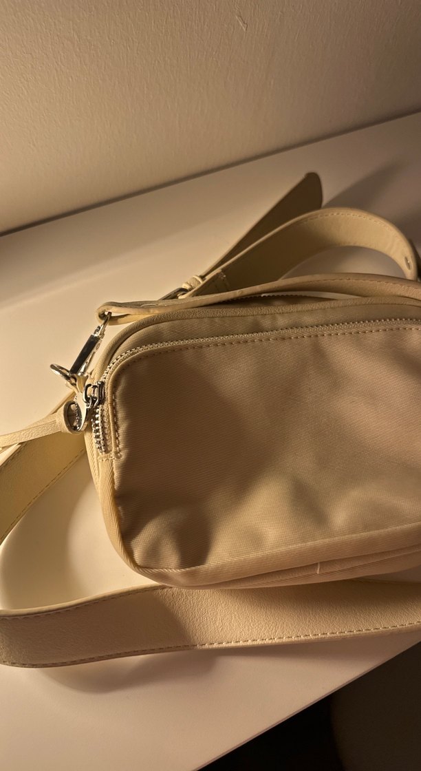 Düz bej renkte, fermuarlı ve parlak görünümlü kadın çapraz çanta. Yumuşak sentetik kumaştan, günlük sokak stiline uygun.