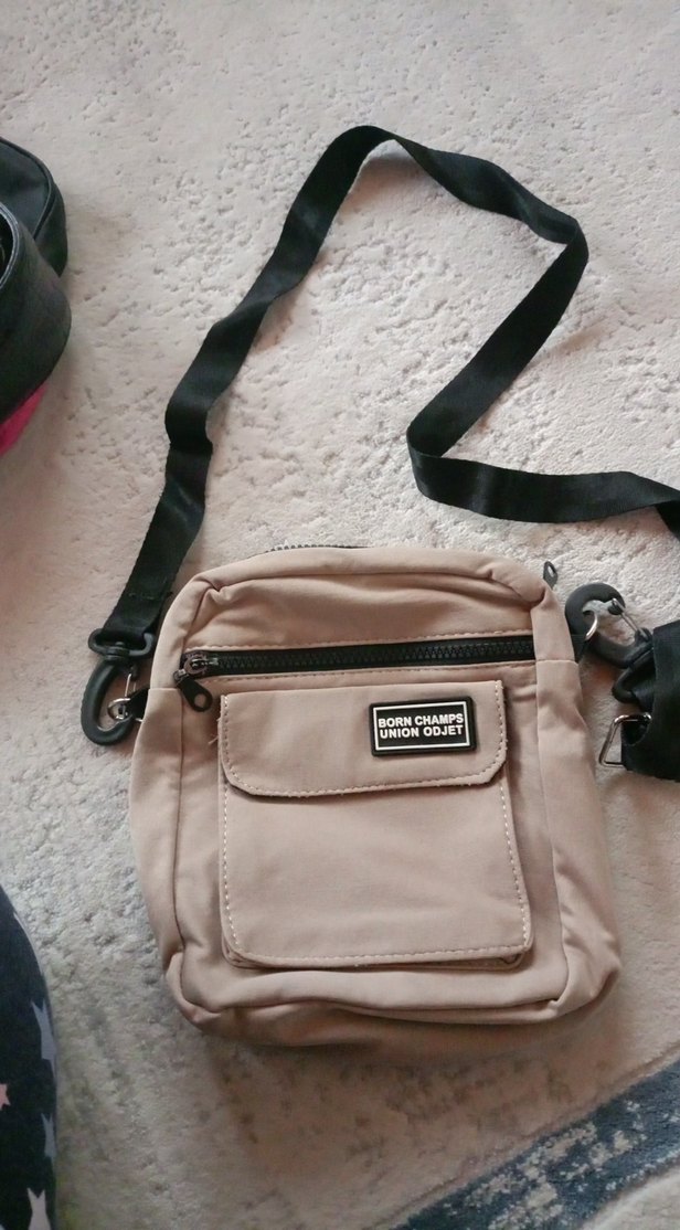 Bej renkli sentetik kumaştan fermuarlı çapraz çanta, ön cepli ve pastel tonlarda, sokak stiline uygun.