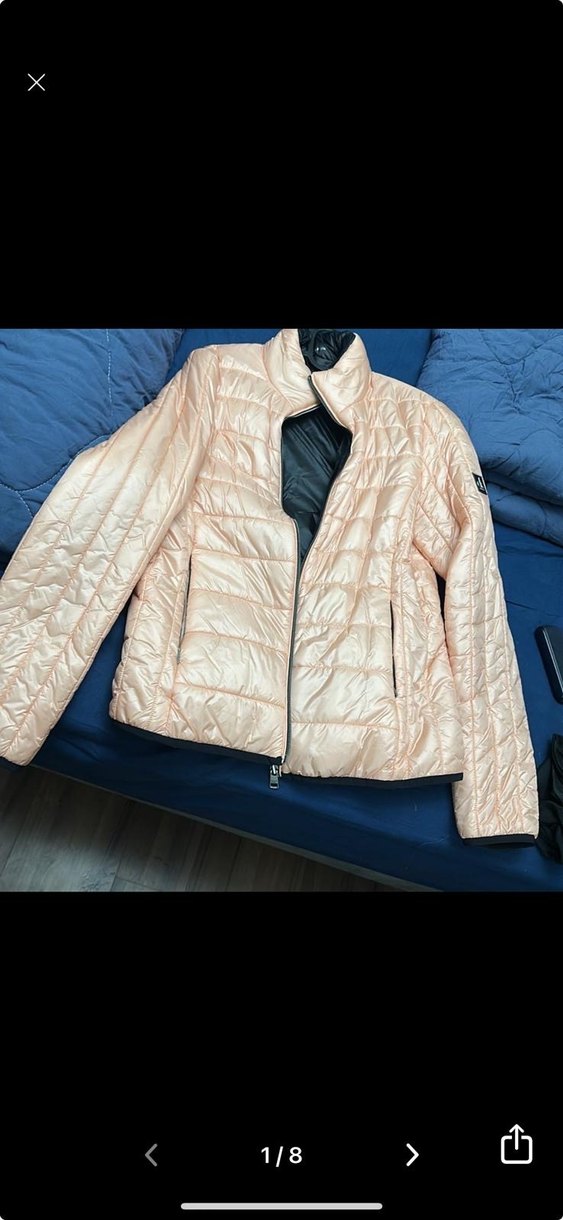Pudra pembe ve siyah Ikı taraflı renkli, fermuarlı ve fitted kesime sahip kadın ceketi. Uzun kollu, sentetik yumuşak kumaştan, notched yaka ve günlük kullanıma uygun rahat stilde.