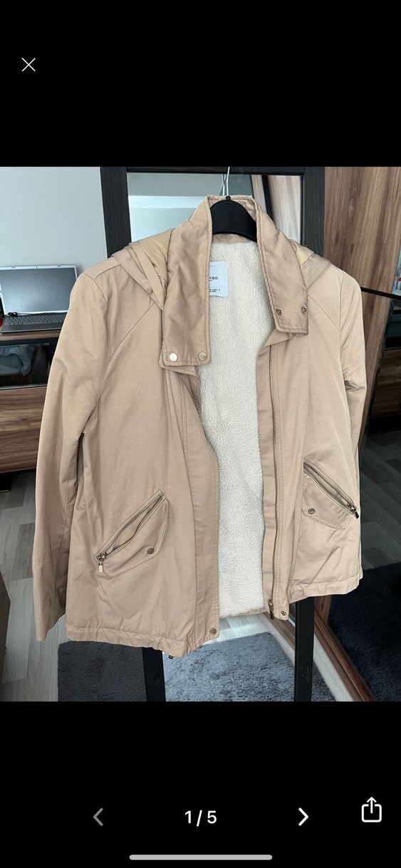 Yumuşak kumaştan yapılmış, bol kesim bej kadın ceket. Çentikli yakalı, fermuarlı ceplerli ve uzun kollu, içi sıcak tutan astarlı.