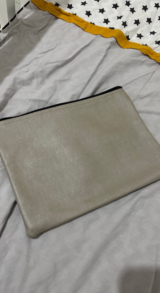 Sentetik kumaştan yapılmış, fermuarlı bej clutch çanta. Minimalist ve desensiz tasarımıyla günlük kullanım için uygundur.