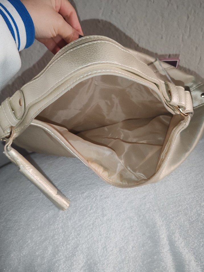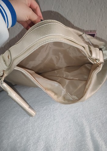 Etiketi bile üzerinde amerikadan Aldm Bej renkte, fermuarlı, desensiz sentetik kumaştan yapılmış kadın çantası. Günlük ve sokak modasına uygun, trend bir tasarım.