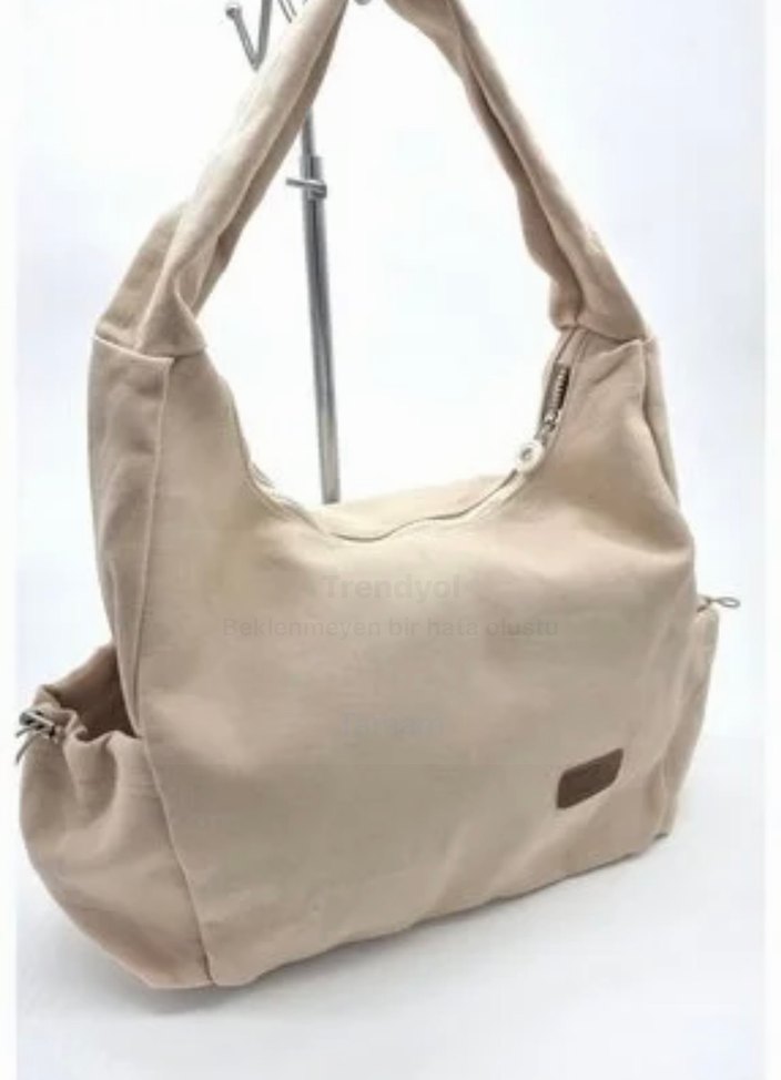 Bej renkli, fermuarlı ve sentetik kumaştan yapılmış kadın çantası. Minimalist ve çağdaş tasarımıyla günlük kullanıma uygun, trend bir model.