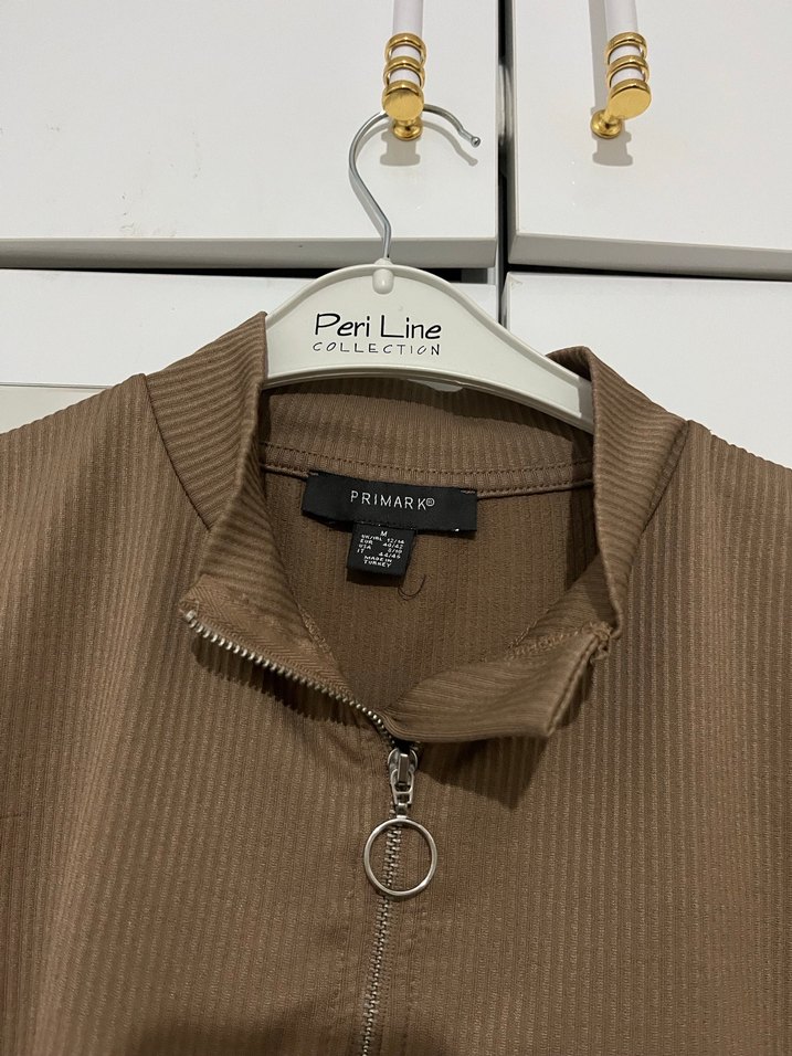 Bej renkli, uzun kollu, bisiklet yaka ve fermuarlı kadın kısa kroptur. Sentetik kumaştan, baskılı deseniyle trend sokak modasına uygundur.