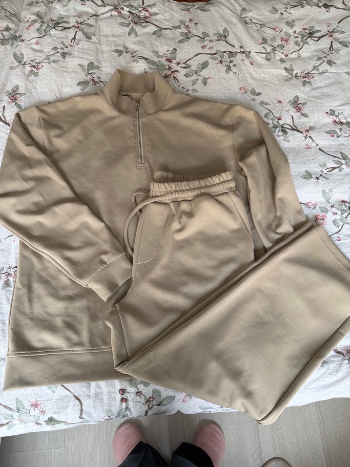 Yumuşak ve sıcak kumaştan, fermuarlı, yüksek yakalı bej kadın rahat uzun kollu takım. Günlük kullanıma uygundur. Hiç kullanılmamış büyük geliyor bedeni kumaş oysho harika