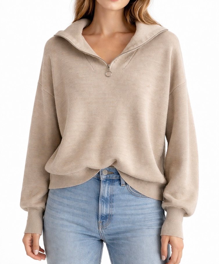 Bej renkli, uzun kollu, salaş kesim, yarım fermuarlı triko. Yumuşak denim kumaştan üretilmiş, günlük kullanıma uygun modern tarz.
