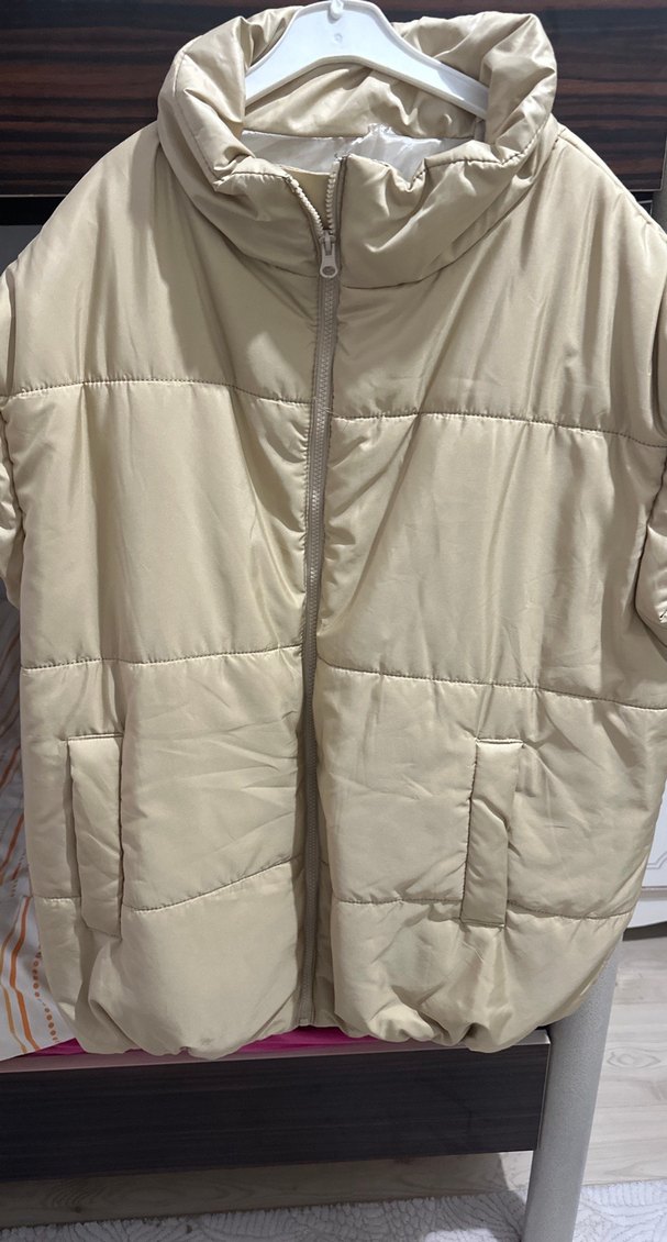 Bej renkli, fermuarlı, yüksek yakalı kadın şişme yelek. Sentetik kumaştan, bol kesim ve normal midi boyda, rahat sokak stili için uygun.