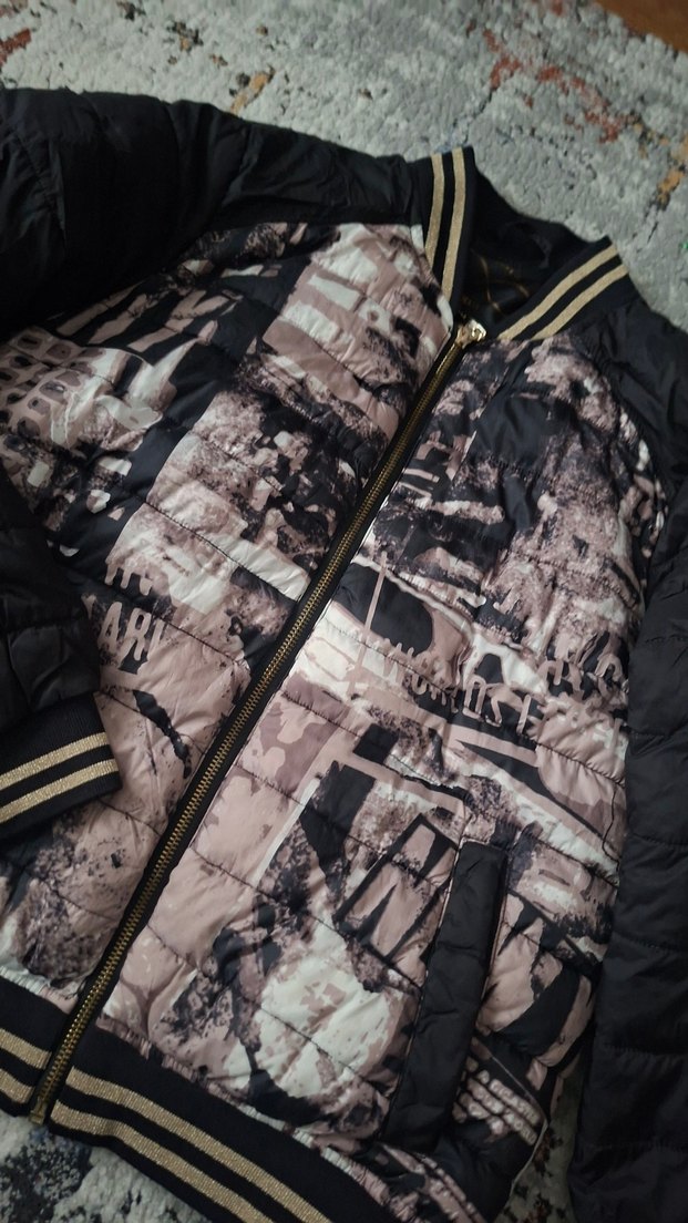 Kadın mont, fermuarlı ön kısmı ve koyu-bej tonlarında şehir baskısıyla sokak stiline uygun şık bir parça.