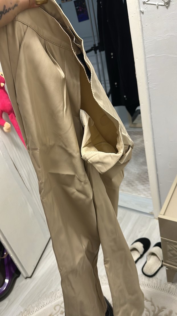 Fermuarlı detaylara sahip bej, dar kesim kumaş pantolon. Midi boy ve street wear tarzında, günlük kullanıma uygun. Hafif ve desensiz.