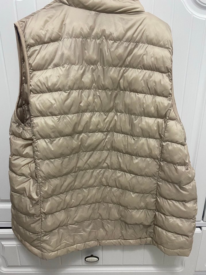 Yüksek yakalı, fermuarlı, bej renkli, kolu olmayan yelek. Kadınlar için normal boyda, sokak stiline uygun, yumuşak sentetik kumaştan yapılmıştır. M-l beden için uyumludur sıcak tutar.