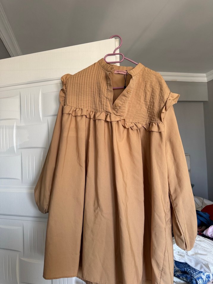Yumuşak keten kumaştan, bol kesim bej midi tunik. Yüksek yakalı, uzun kollu ve göğüs kısmında fırfırlı detaylı, bohem tarzına uygun.