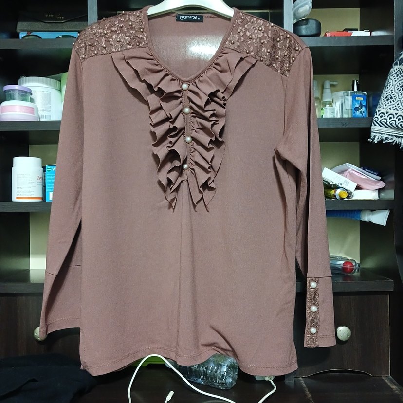 Bej renkte, uzun kollu, yuvarlak yaka ve bol kesim bluz. Ön kısmında fırfır detayları ve manşetlerde inci düğmeler bulunur. anneme olmadığı icin satışta yenidir