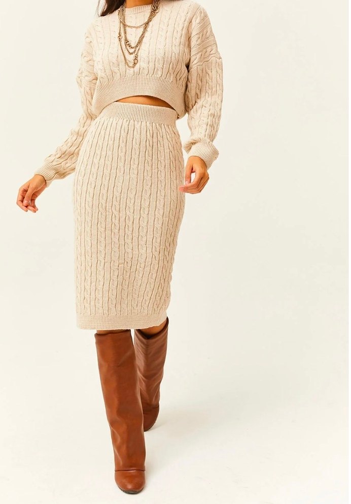 Bej renkli, fit kesim, uzun kollu ve yuvarlak yakalı kalın triko elbise, günlük kullanıma uygun sıcak ve modern bir tasarıma sahiptir. Çok şık. Aynen göründüğü gibidir. Kesintiyi hesap ederek koydum. Etiketi koparılmış.