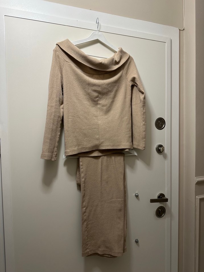 Bej renkte fitilli kumaştan, uzun kollu kadın takımı. Minimalist ve normcore tarzıyla gündelik şıklık sunar. Rahat kesim ve kayık yaka detaylıdır.