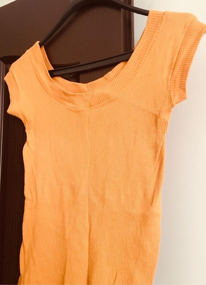 Bej renkte, tek renk, kolsuz ve tekne yakalı kadın tişörtü. Fitted kesimi ve midi boyu ile rahat ve şık bir günlük parça.
