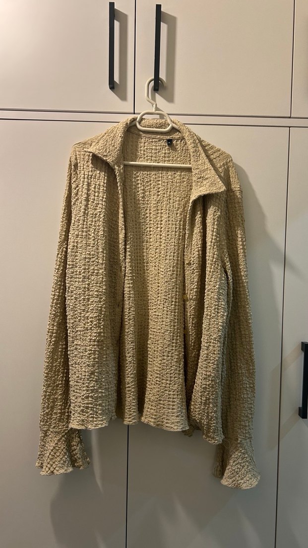 Bej renkli, uzun kollu, kadın gömleği. Notch yaka ve bol kesim ile bohem tarzda, günlük kullanım için uygun.
