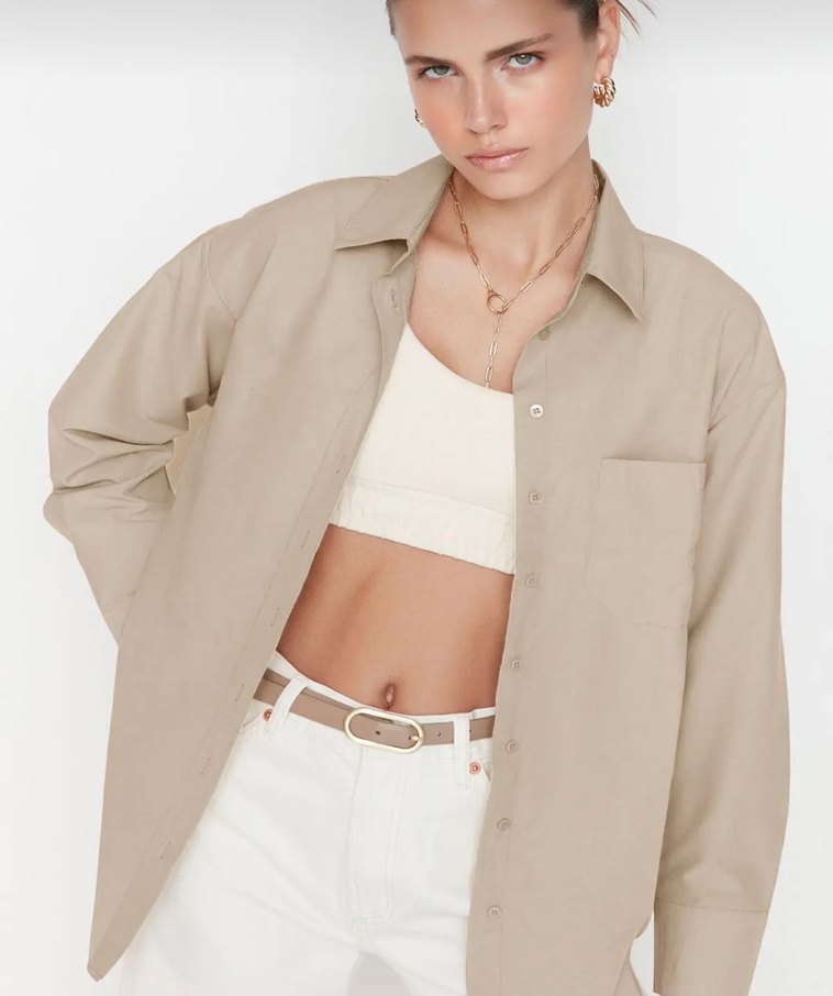 Bej Kadın Gömlek Oversize Uzun Kollu