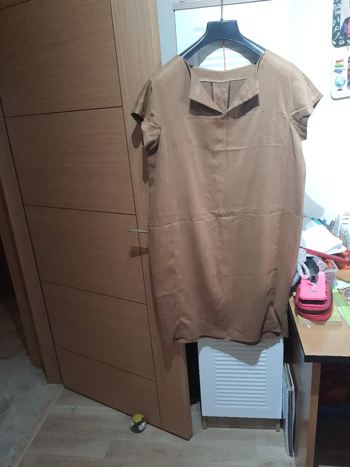 Bej renkte, kısa kollu ve yuvarlak yakalı hamile elbise. Rahat kesimi ve midi boyuyla günlük kullanım için şık ve konforlu bir tercih. özel dikimdir güderi görünümlü